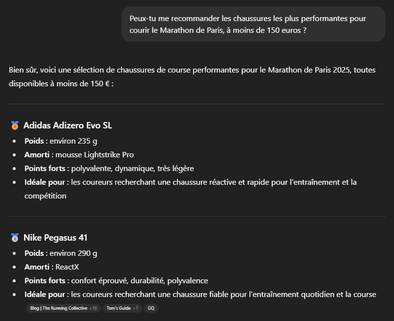 Autre situation classique, ce client recherche des informations cette fois sur le type de produit que vous vendez (exemple : une paire de chaussure de running), mais les réponses des IA ne citent que les références de vos concurrents, vos produits restent invisibles dans les résultats.