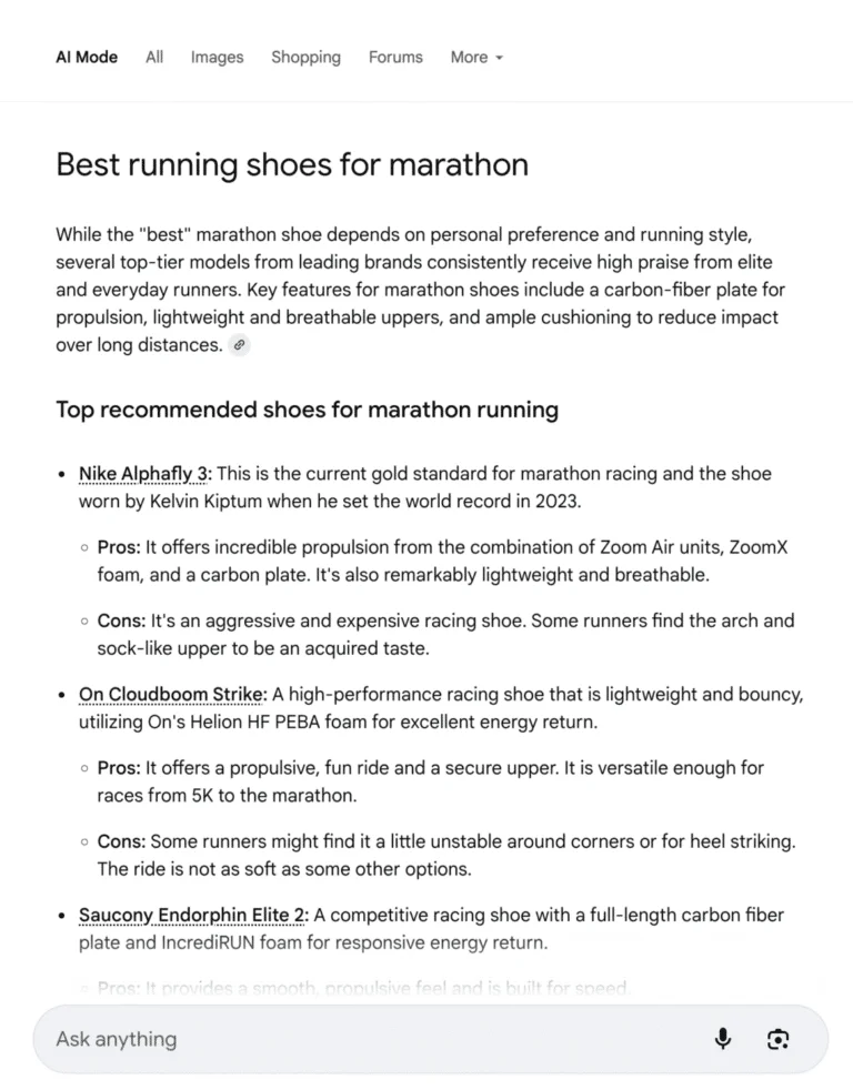 Ce qui est inédit réside dans le fait qu’au lieu de simplement lister des liens, il sélectionne et cite un certain nombre de sources jugées fiables pour construire une réponse directe, renforçant ainsi la tendance du zéro clic. L’utilisateur peut directement obtenir sa réponse, sans avoir besoin de nécessaire naviguer sur les sites internet listés plus bas.